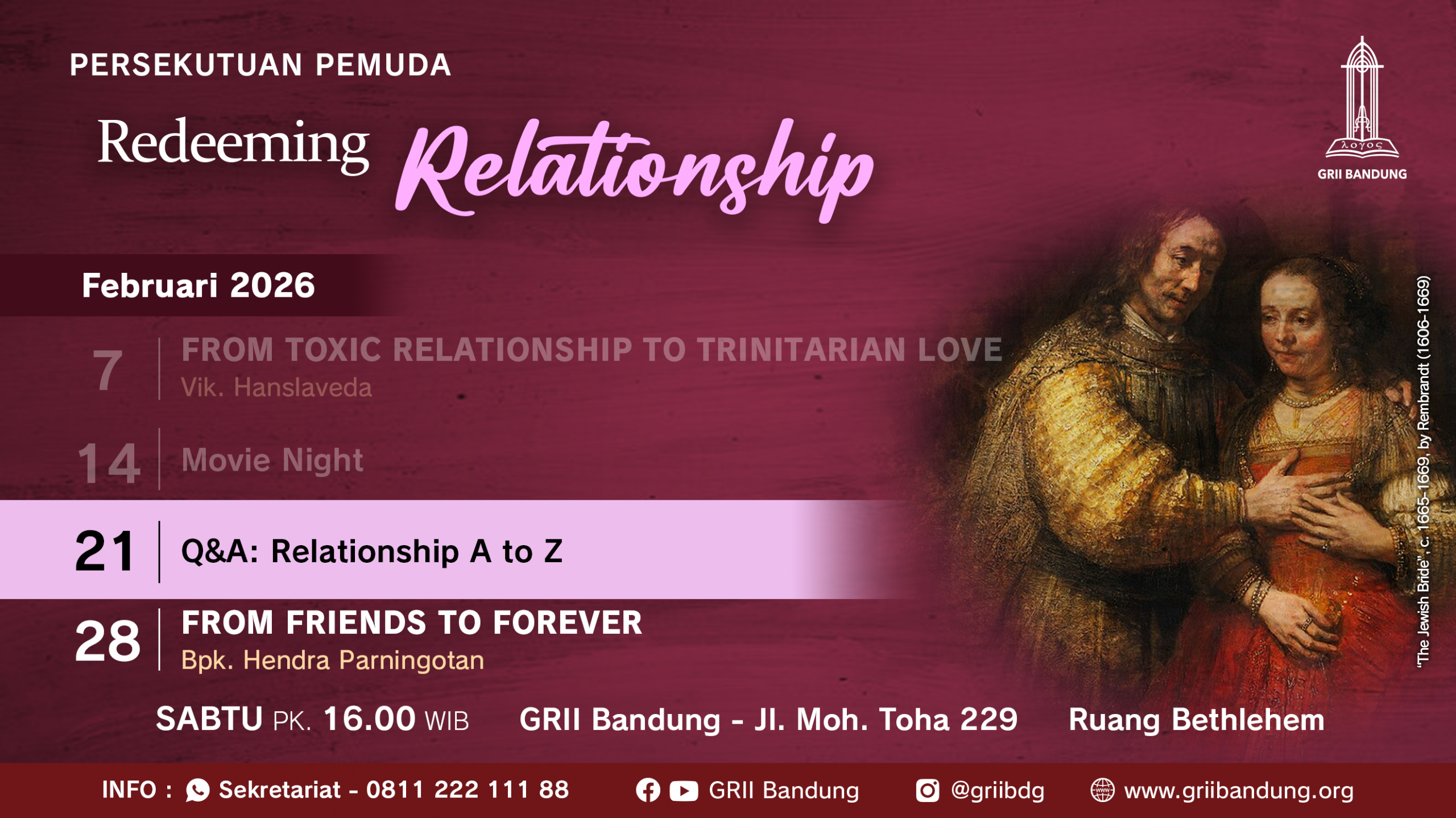 Dengan tema "Q & A: Relationship A to Z" pada hari Sabtu, 21 Februari 2026, pk. 16.00 di Jl. Moh. Toha no. 229. Info: 0811-222-111-88 (WA)