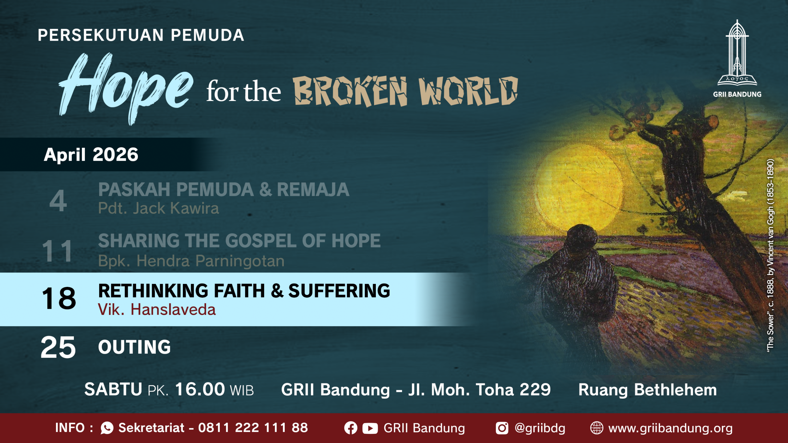 Dengan tema "Rethinking Faith & Suffering” oleh Vik. Hanslaveda, pada hari Sabtu, 18 April 2026, pk. 16.00 di Jl. Moh. Toha no. 229. Info: 0811-222-111-88 (WA)