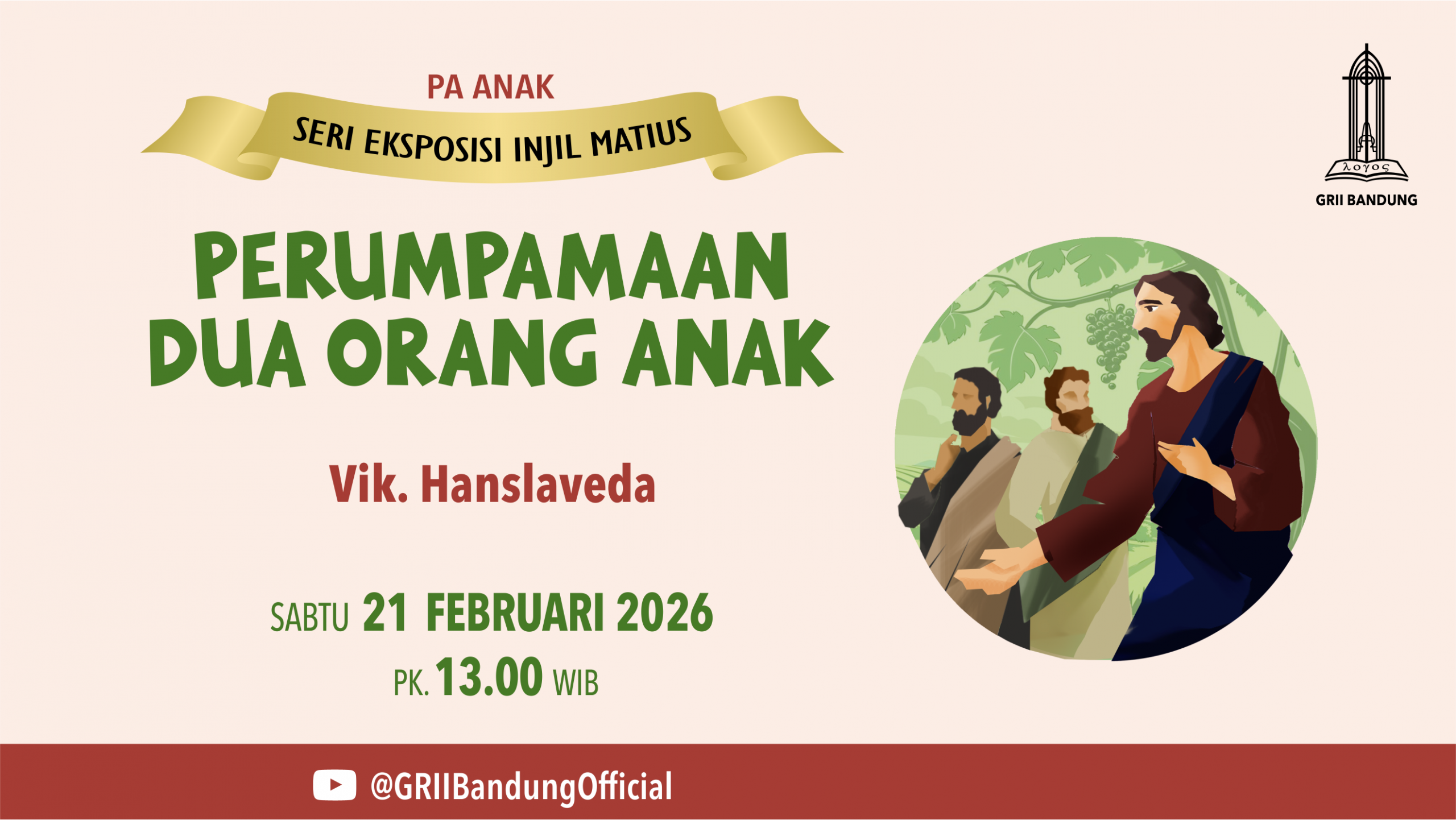 Dengan tema “Perumpamaan Dua Orang Anak” oleh Vik. Hanslaveda pada Sabtu, 21 Februari 2026, pk. 13.00 WIB. Streaming: griibdg.org/live