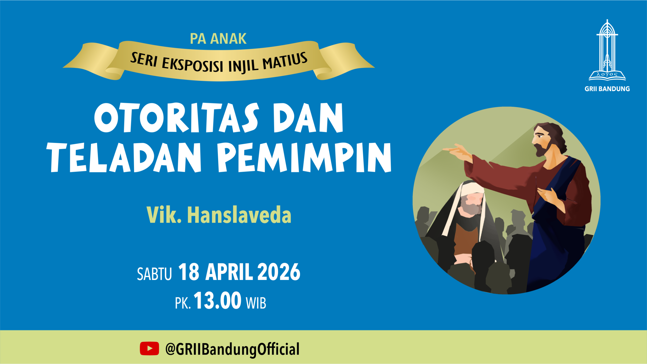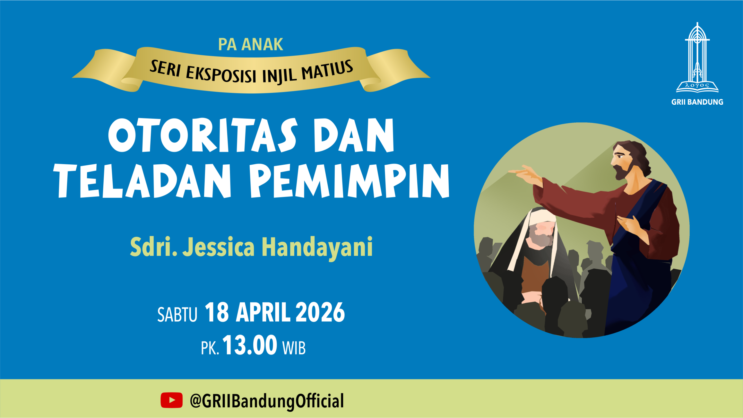 Dengan tema “Otoritas & Teladan Pemimpin” oleh Sdri. Jessica Handayani pada Sabtu, 18 April 2026, pk. 13.00 WIB. Streaming: griibdg.org/live