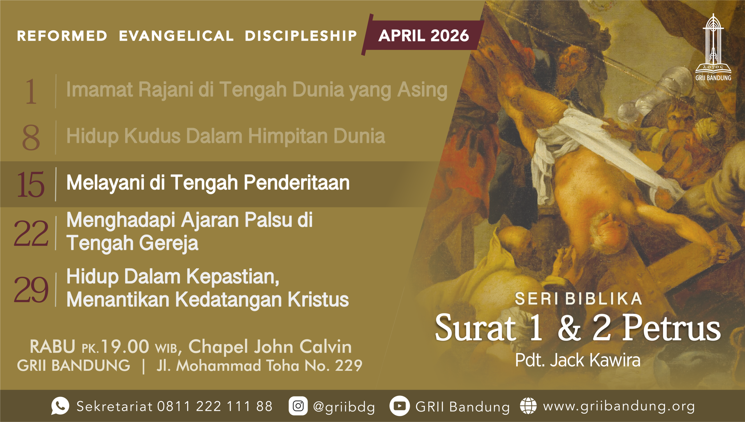 Dengan tema "Melayani di Tengah Penderitaan" oleh Pdt. Jack Kawira, pada hari Rabu, 15 April 2026, pk. 19.00 di GRII Bandung Jl. Moh. Toha no. 229. Info: Sekretariat 0811-222-111-88
