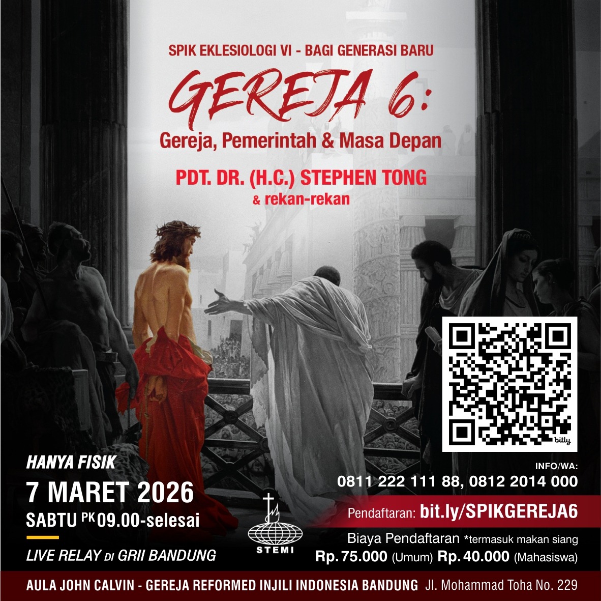 Dengan tema “Gereja 6: Gereja, Pemerintah & Masa Depan” oleh Pdt. Dr. Stephen Tong dan rekan-rekan. Pada hari Sabtu, 7 Maret 2026, pk. 09.00 di GRII Bandung (Toha). Biaya: Rp75.000 (umum), Rp40.000 (mahasiswa). Pendaftaran: bit.ly/SPIKGEREJA6 Info: Sekretariat 0811-222-111-88 / Ibu Linda 0812-2014-000