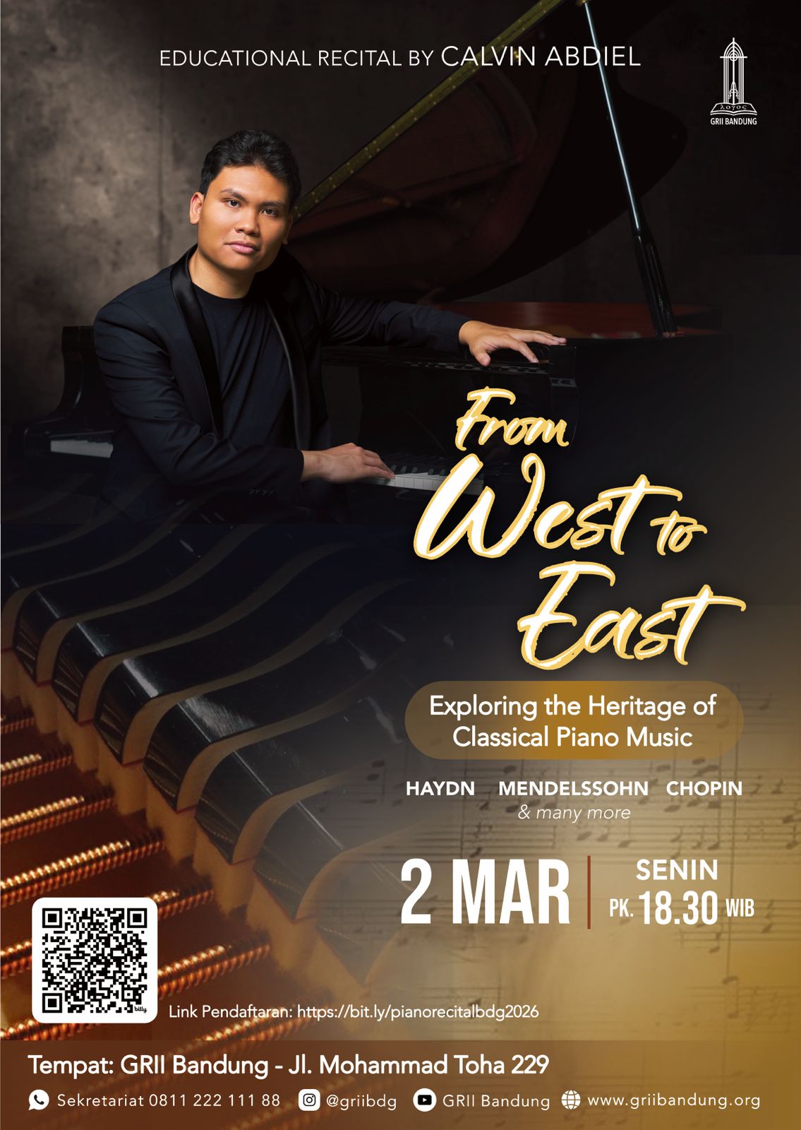 Oleh Calvin Abdiel pada hari Senin, 2 Maret 2026, pk. 18.30 di Chapel John Calvin, GRII Bandung (Toha). Pendaftaran: bit.ly/pianorecitalbdg2026. Info: Sekretariat 0811-222-111-88