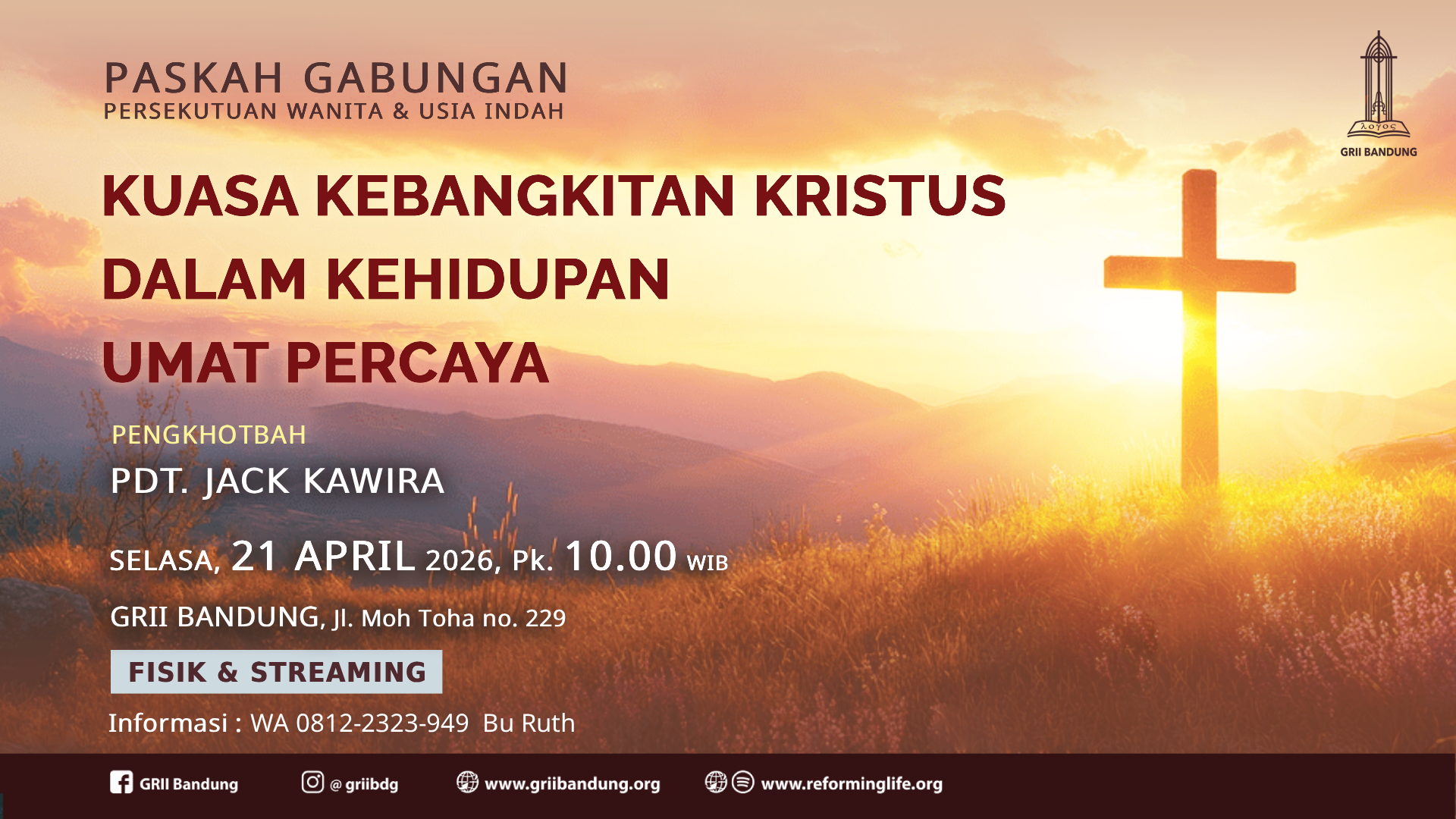 Dengan tema “Kuasa Kebangkitan Kristus dalam Kehidupan Umat Percaya” oleh Pdt. Jack Kawira pada hari Selasa, 21 April 2026, pk. 10.00 di GRII Bandung (Toha). Info: Vik. Ho Yun Siang 0812-2323-949