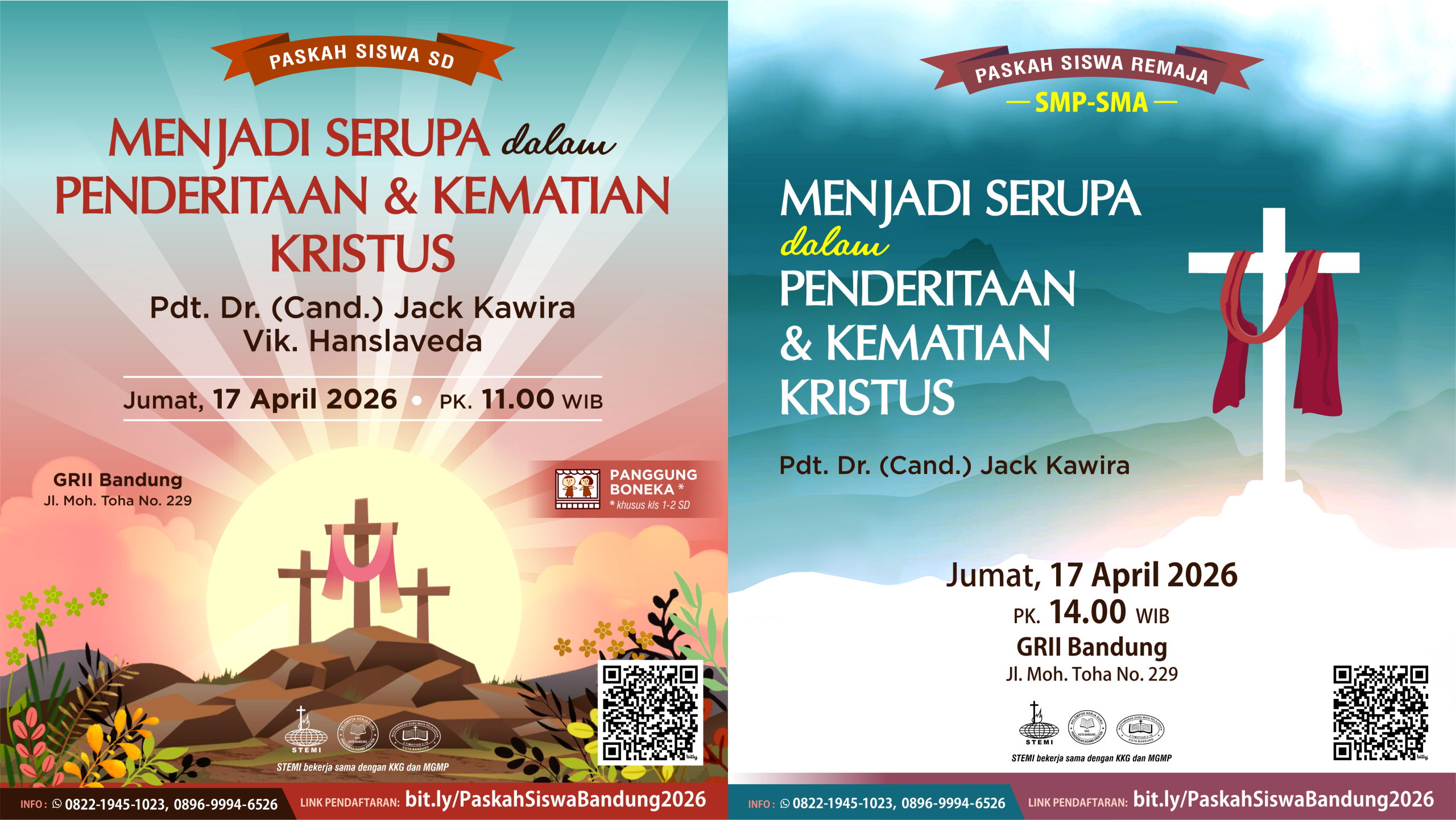 Dengan tema “Menjadi Serupa dalam Penderitaan & Kematian Kristus” oleh Pdt. Jack Kawira, pada hari Jumat, 17 April 2026, pk. 11.00 (SD) & pk. 14.00 (SMP-SMA). Pendaftaran: bit.ly/PaskahSiswaBandung2026. Info: Bpk. Kiki 0822-1945-1023 / Bpk. Weliam 0896-9994-6526
