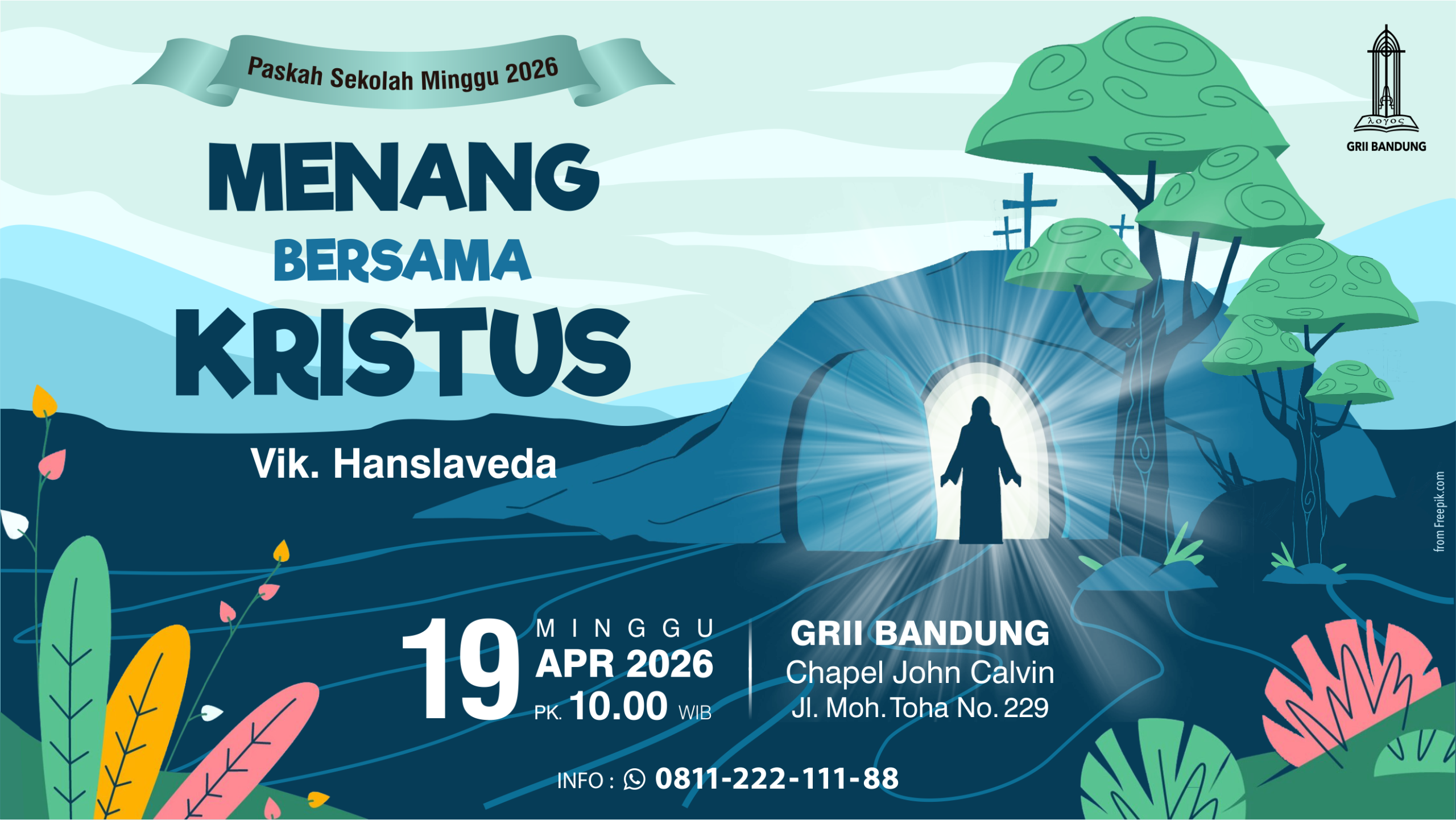 Dengan tema "Menang bersama Kristus” oleh Vik. Hanslaveda pada hari Minggu, 19 April 2026, pk. 10.00 di GRII Bandung Jl. Moh. Toha no. 229. Info: 0811-222-111-88