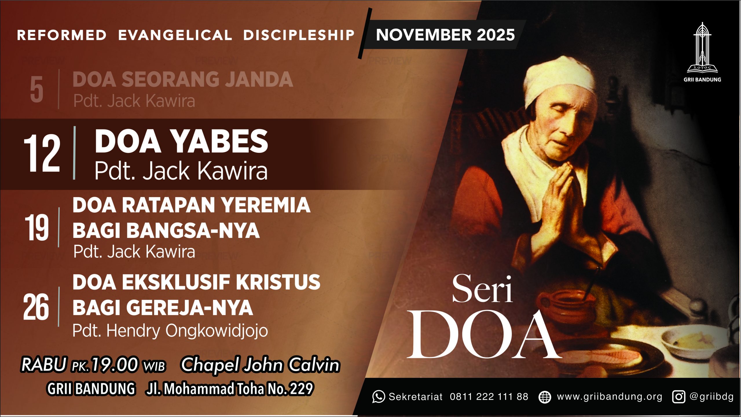 Dengan tema Seri Doa “Doa Yabes” oleh Pdt. Jack Kawira pada hari Rabu, 12 November 2025, pk. 19.00, di Moh. Toha no. 229. Hanya fisik. Info: Sekretariat 0811-222-111-88