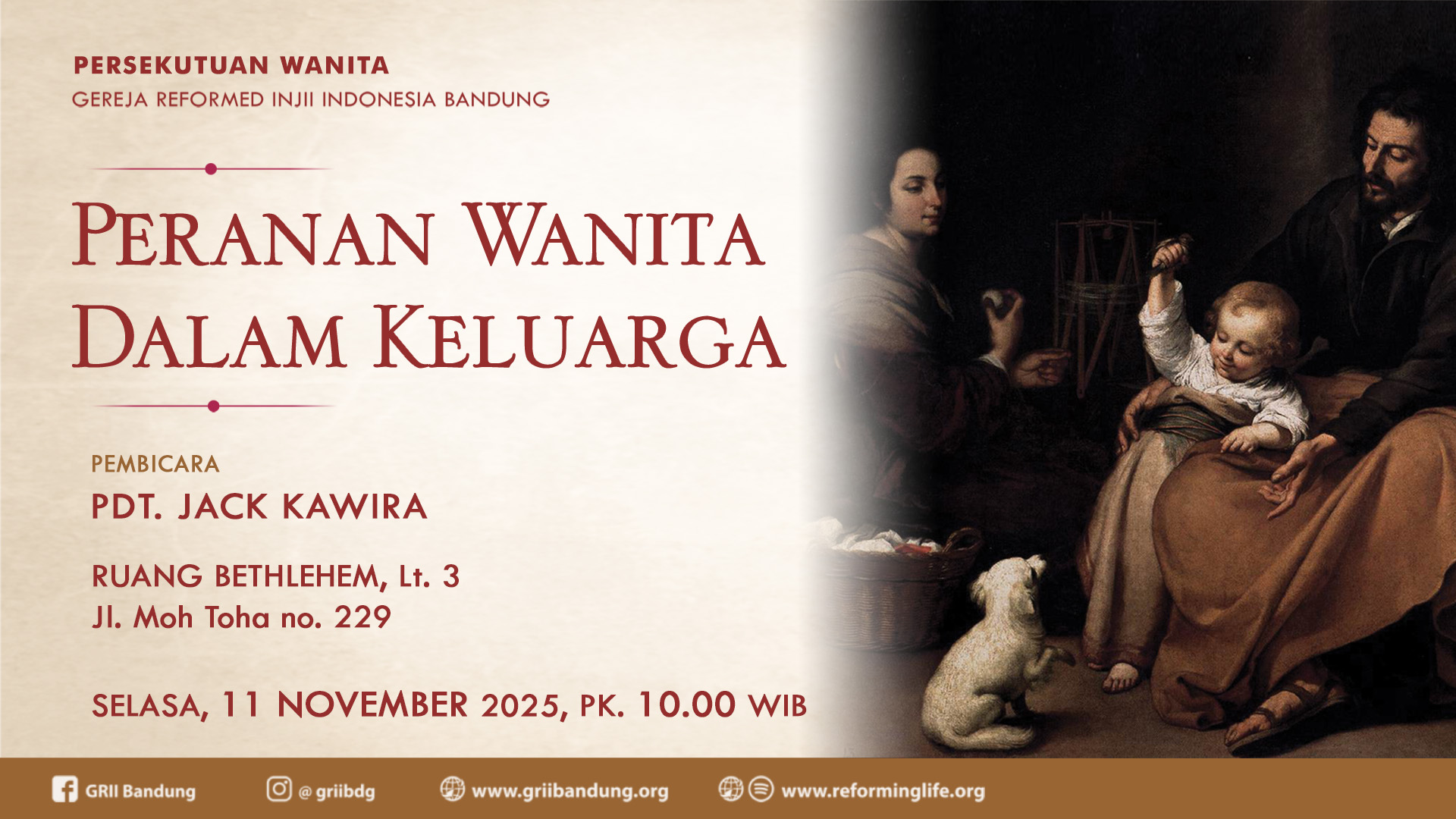 Dengan tema “Peranan Wanita dalam Keluarga” oleh Pdt. Jack Kawira pada hari Selasa, 11 November 2025, pk. 10.00 di GRII Bandung Jl. Moh. Toha no. 229. Info: Sekretariat 0811-222-111-88