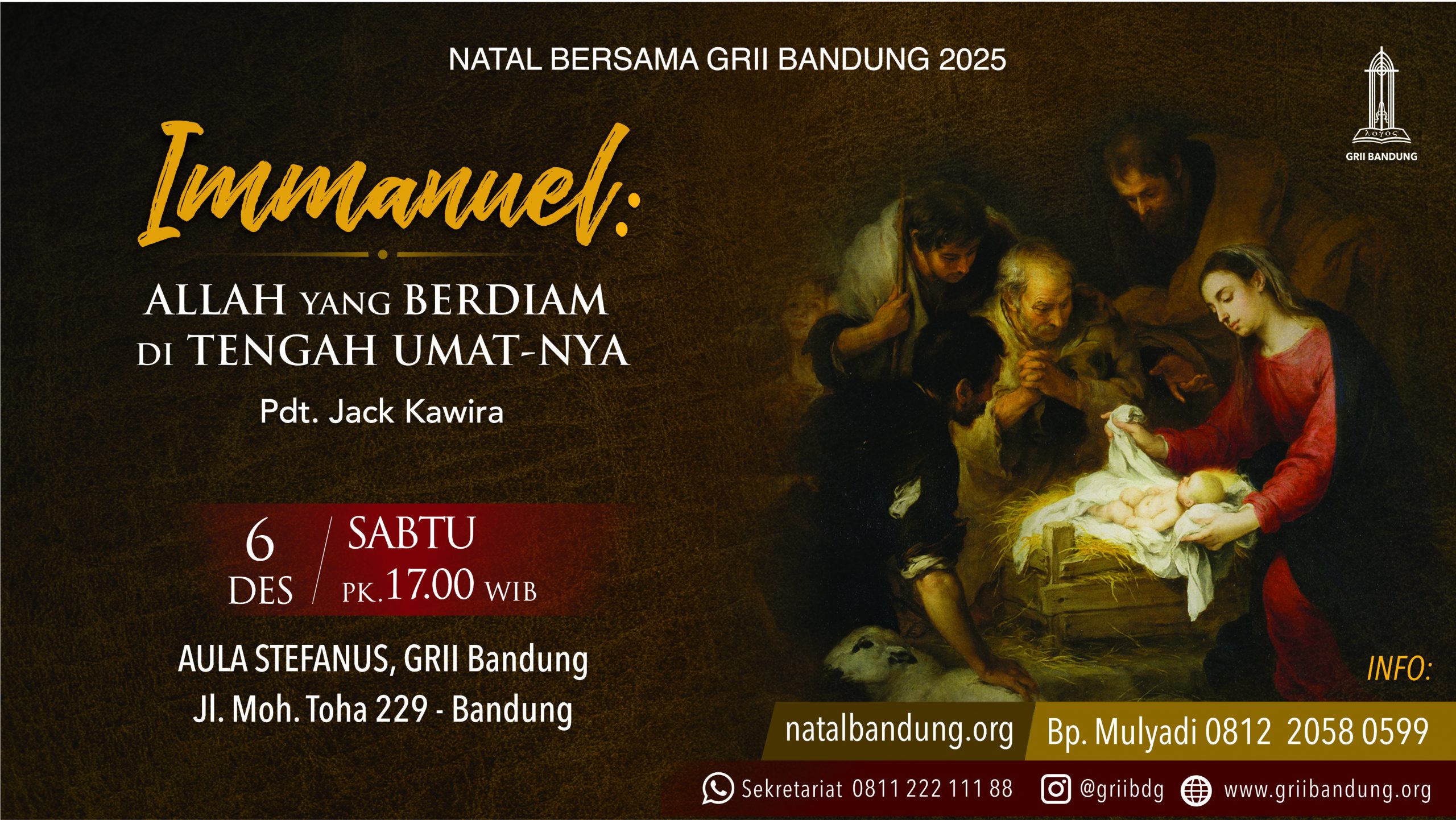 Dengan tema “Immanuel: Allah yang Berdiam di Tengah Umat-Nya” dipimpin oleh Pdt. Jack Kawira, pada hari Sabtu, 6 Desember 2025, pk 17.00 di GRII Bandung (Toha). Website: natalbandung.org. Info: Bpk. Mulyadi 0812-2058-0599 / Sekretariat 0811-222-111-88