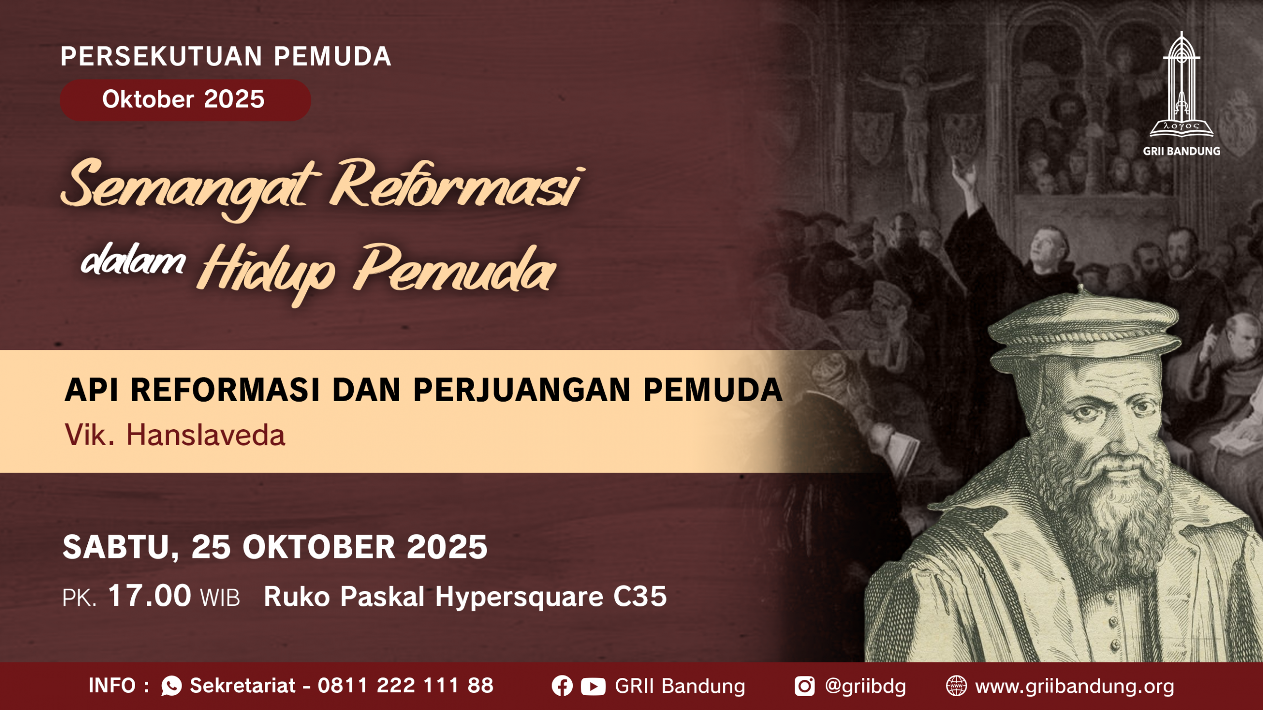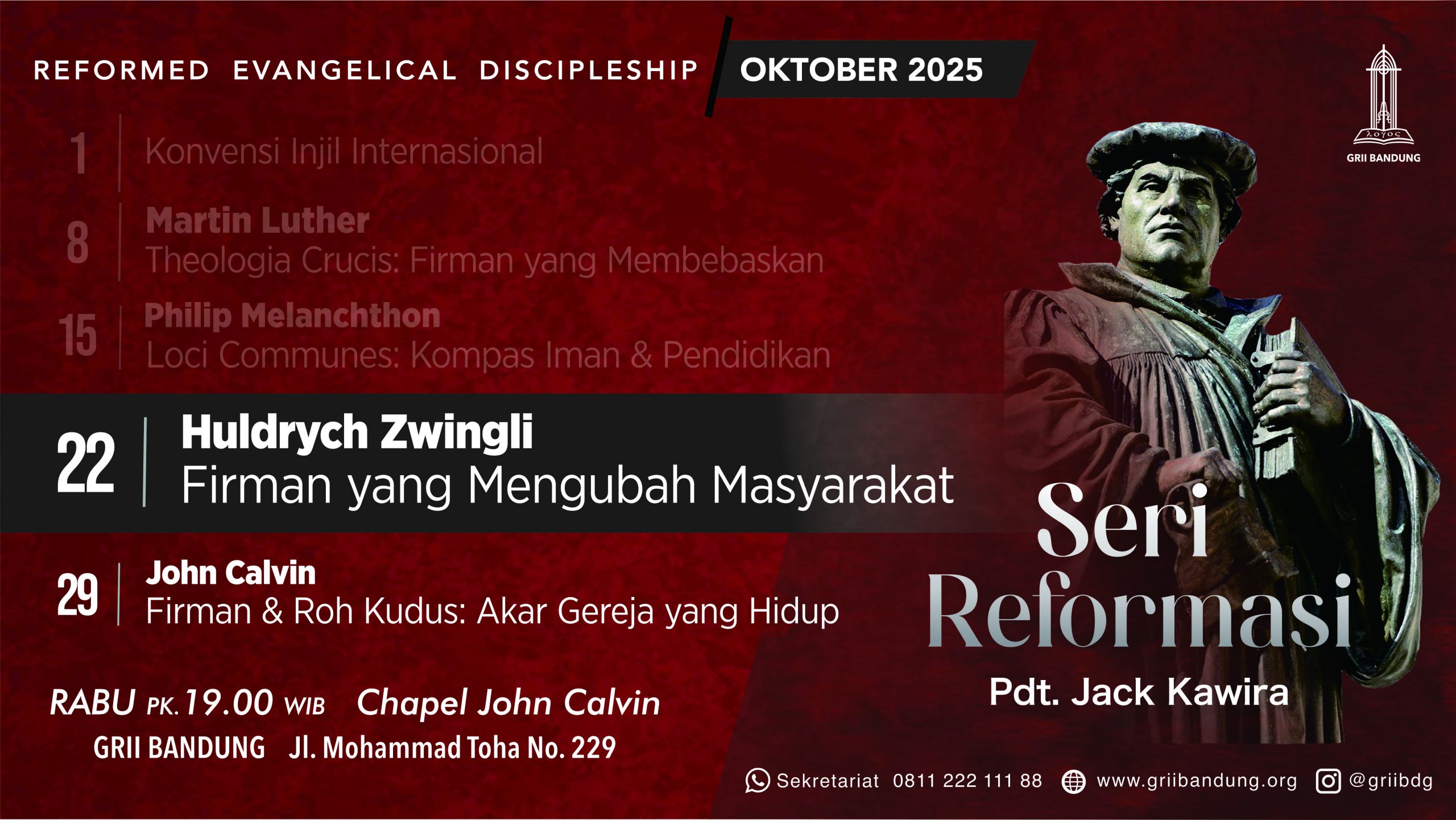 Dengan tema Seri Reformasi Huldrych Zwingli “Firman yang Mengubah Masyarakat” oleh Pdt. Jack Kawira pada hari Rabu, 22 Oktober 2025, pk. 19.00, di Moh. Toha no. 229. Hanya fisik. Info: Sekretariat 0811-222-111-88