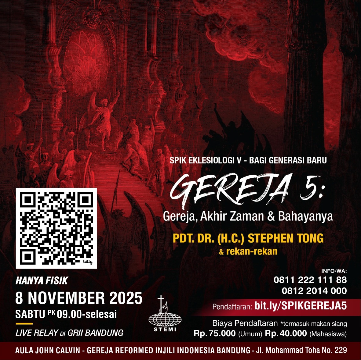 Dengan tema “Gereja 5: Gereja, Akhir Zaman & Bahayanya” oleh Pdt. Dr. Stephen Tong dan rekan-rekan. Pada hari Sabtu, 8 November 2025, pk. 09.00 di GRII Bandung (Toha). Biaya: Rp 75.000 (umum), Rp 40.000 (mahasiswa). Pendaftaran: bit.ly/SPIKGEREJA5 Info: Sekretariat 0811-222-111-88 / Ibu Linda 0812-2014-000